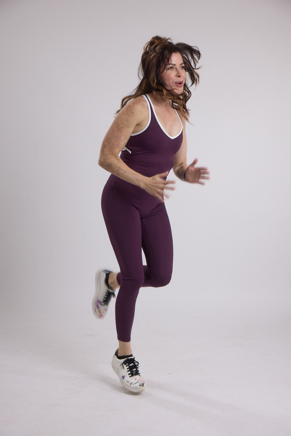 The Caroline Set in wine red with sleek white side stripes creates a flattering silhouette...