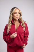 Wine Red Zip Sweatshirt. Cozy, soft, and slightly oversized, this wine-red sweatshirt features a front zip and a stand-up collar for adjustable coverage. Perfect for layering or lounging in comfort and style.