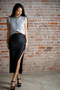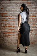 This stunning long black skirt features a watery ribbed texture, a flattering side slit, and plenty of stretch for ultimate comfort. Tight and body-hugging, it highlights your figure beautifully, making it a show-stopping piece for any occasion.