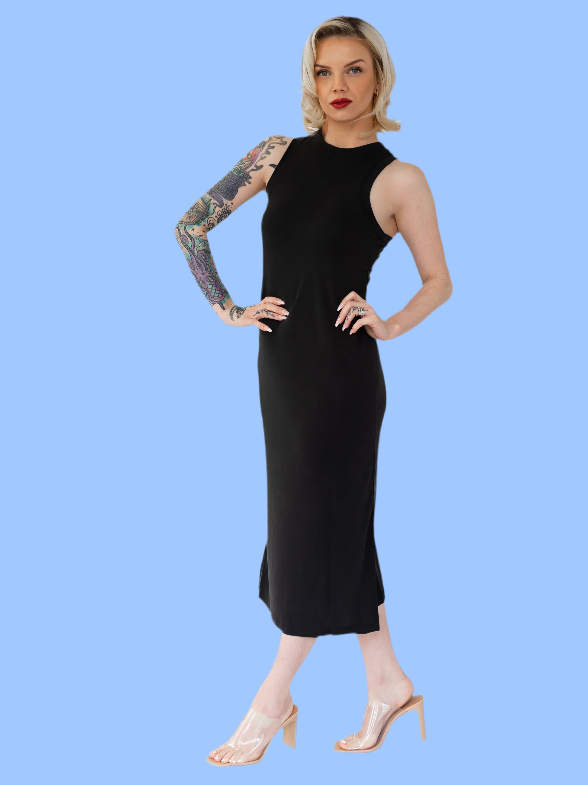 Slay the scene in this round-neck, sizzling sleeveless midi dress in smoldering black.