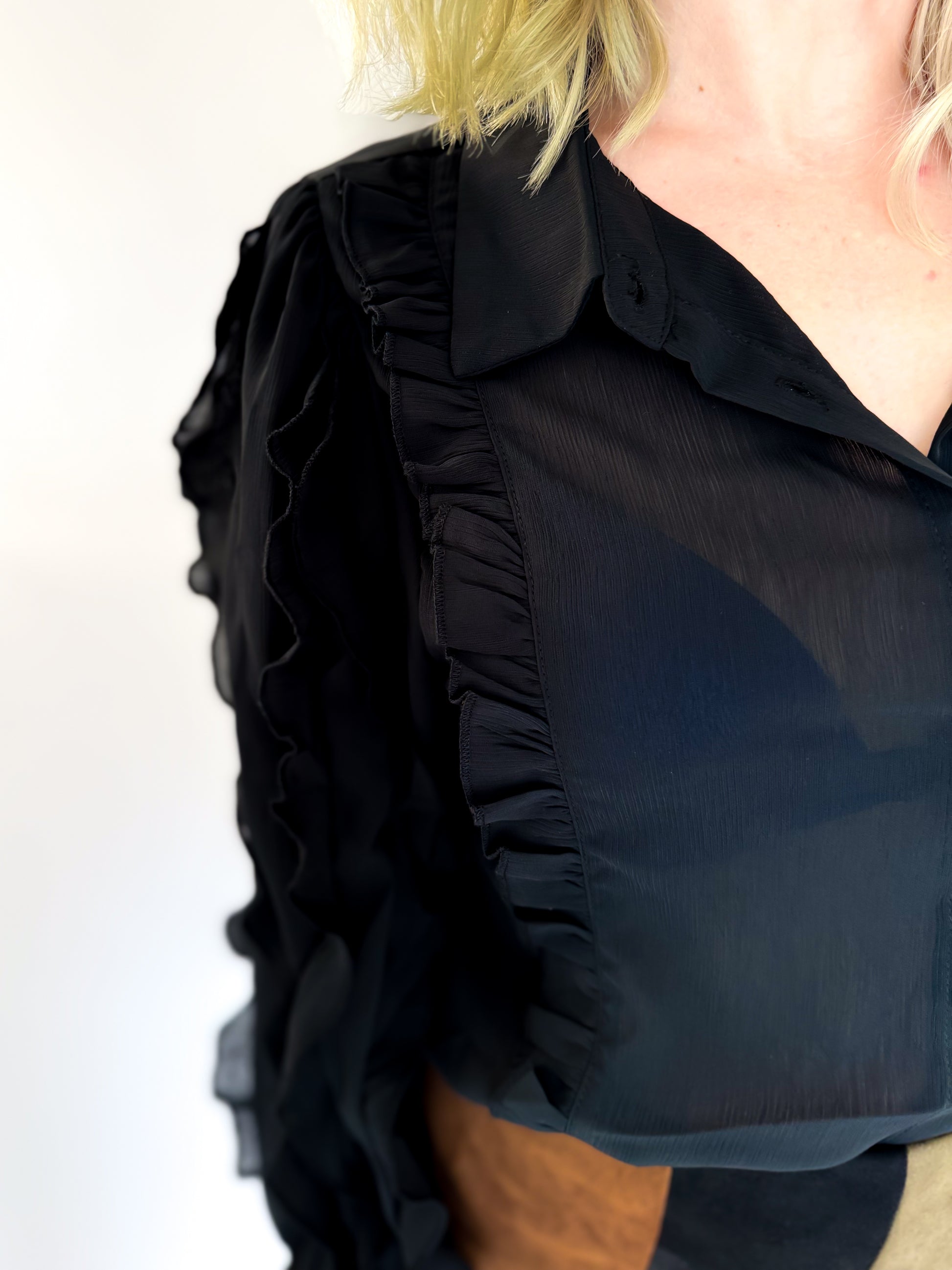 This Ruffle Blouse is the perfect wardrobe addition for anyone looking to make a statement. The black mesh fabric and button-down design with ruffles make a fashionable combination, ensuring a trendy and sexy look.