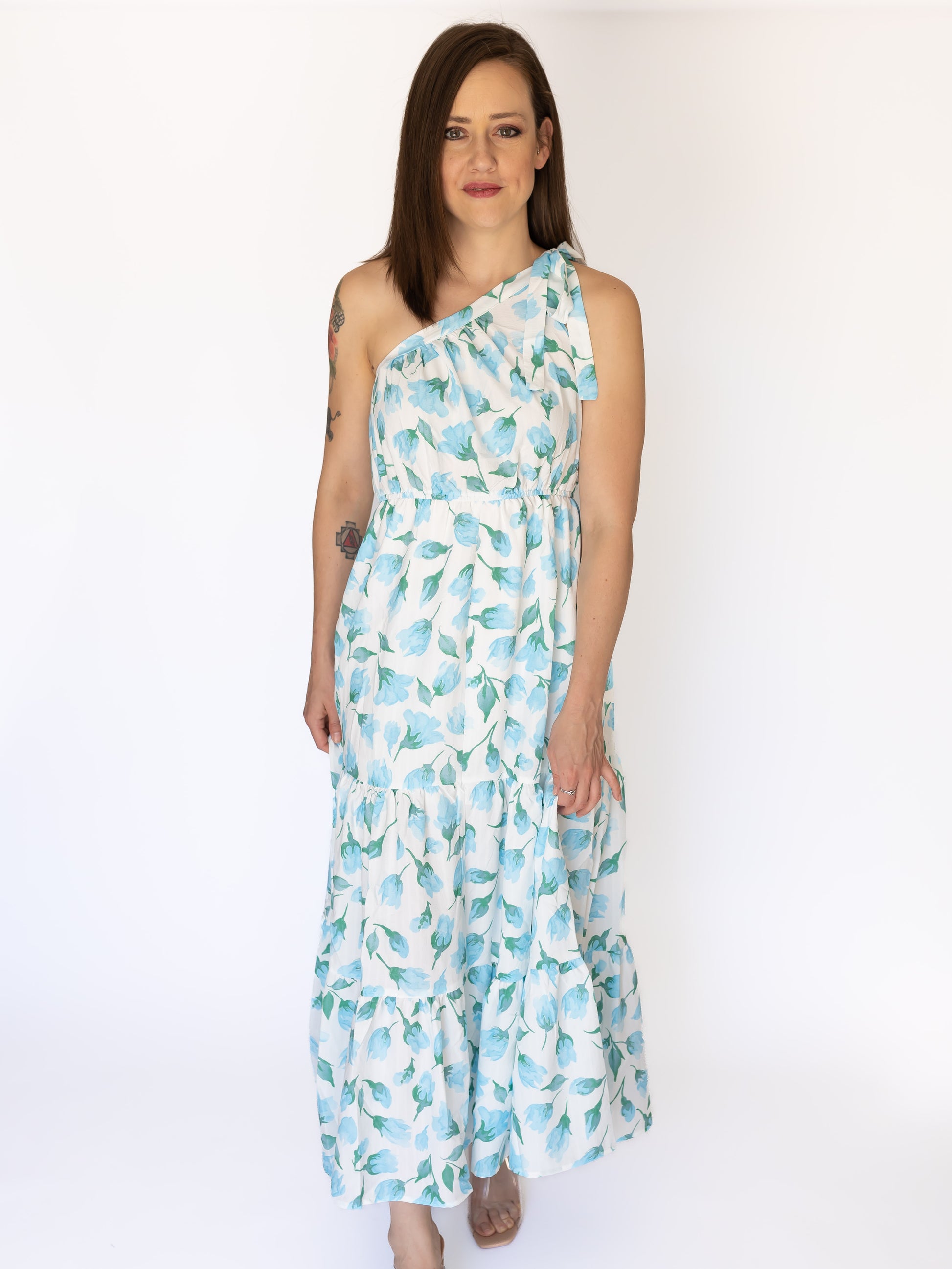 Sway in style in this daringly-chic maxi one shoulder tie floral dress in blue! Flaunt your fashionista risks with flair.