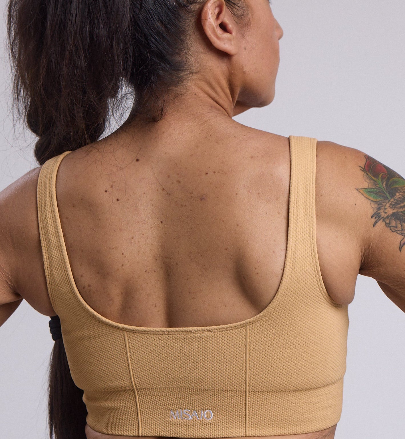 A gorgeous earthy yellow waffle sports bra with a textured feel and thicker, supportive fabric. Unique, flattering, and an absolute must-have for your workouts.